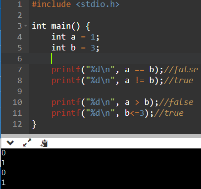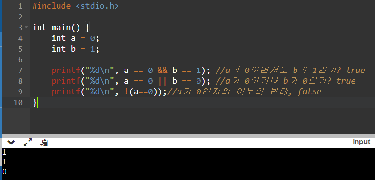 printf("%d\n", a == 0 && b == 1); //a가 0이면서도 b가 1인가? true