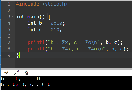 printf("b : %#x, c : %#o\n", b, c);//접두사와 함께 출력하기
