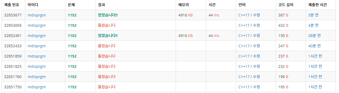 이게 필자의 제출 기록인데 보다시피 실패가 아주 많다..ㅋㅋ