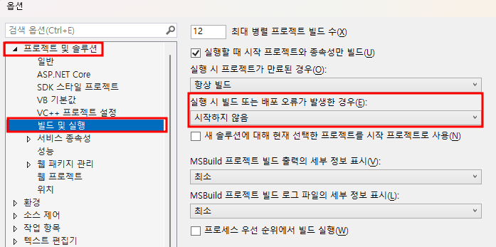 프로젝트 및 솔루션 -> 빌드 및 실행에 해당 설정이 있다.