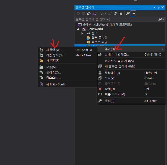 솔루션 탐색기 -> 소스 파일 우클릭 -> 아래 경로를 따라도 되고