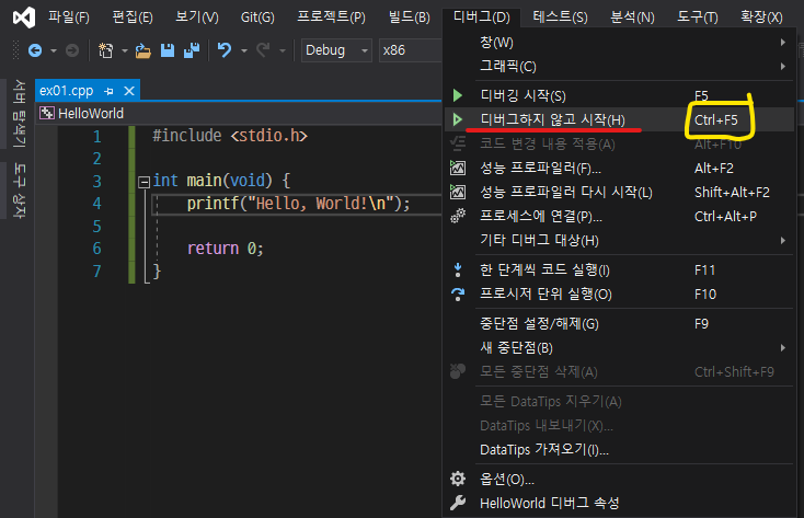 상단 메뉴에서 디버그 -> 디버그하지 않고 시작