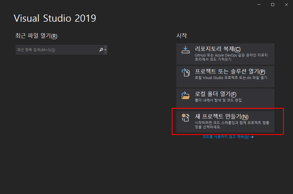 먼저 Visual Studio(이하 vs)를 실행해주고